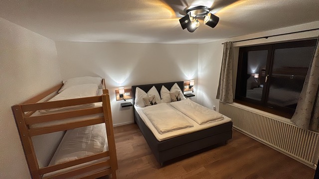 Deze Ferienwohnung beschikt over één comfortabele, rustige slaapkamer die zorgt voor een heerlijke nachtrust. De houten details geven de ruimte een knusse en ontspannen sfeer.