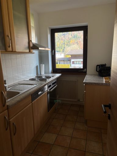 De aparte keuken is praktisch en volledig uitgerust, met houten kasten, een granieten werkblad, elektrische kookplaat en ingebouwde vaatwasser. Een functionele en gezellige ruimte om comfortabel te koken.